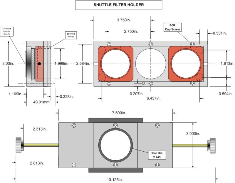Filter Holder- 3 positions A , B, or none This design is a manual shuttle and holds 2 filters in the shuttles. One can be fixed in the nosepiece. Body of holder is machined from 6061 aluminum. Filter holder/ shutters machined from black Delrin. |